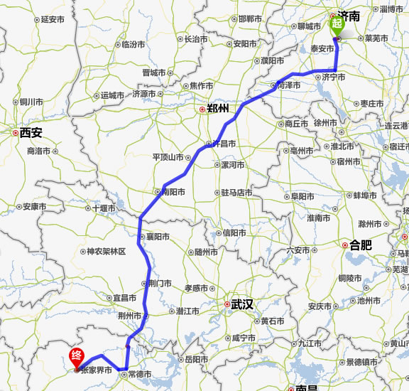 左右,沿途經過泰安——寧陽縣——濟寧市——菏澤市——蘭考縣——許昌市——平頂山——南陽——襄陽——荊門——荊州——常德(也可以走國道經澧縣、石門縣)——慈利——張家界。